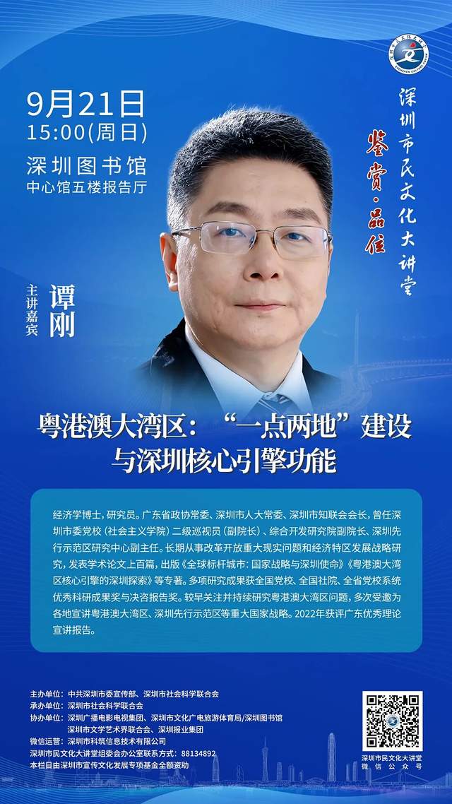 本周日,廣東省政協常委、深圳市人大常委、深圳市知聯會會長譚剛將蒞臨市民文化大講堂,他將系統闡釋“一點兩地”的戰略意涵,深入剖析深圳在粵港澳大灣區協同格局中的角色定位與實踐路徑,為我們呈現一場兼具思想高度與現實洞察的深度分享。