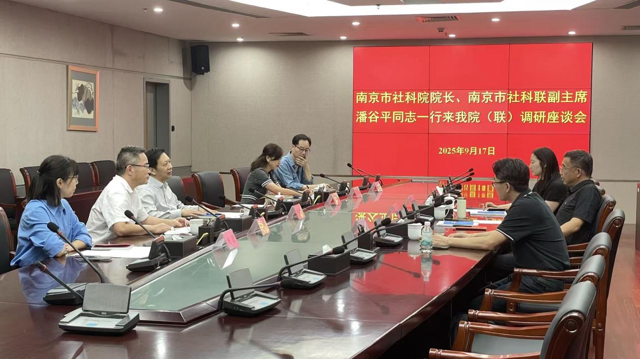 2025年9月17日,南京市社科院院長、南京市社科聯副主席潘谷平一行來我院(聯)調研座談。我院(聯)黨組書記、院長(主席人選)何新紅主持座談會。